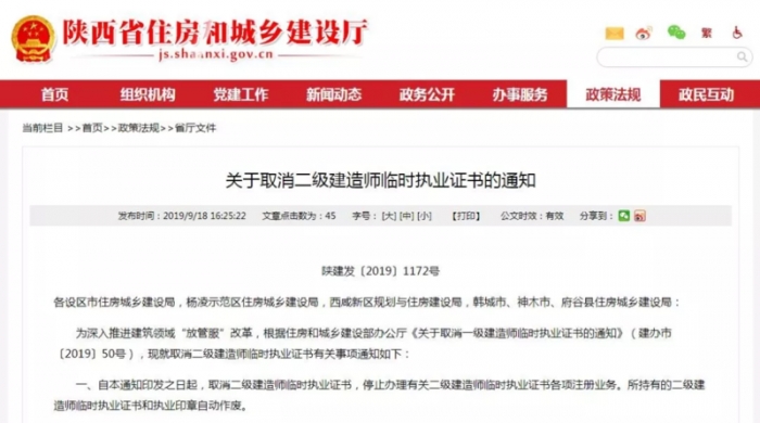陜西省住房和城鄉(xiāng)建設廳關于取消二級建造師臨時執(zhí)業(yè)證書的通知