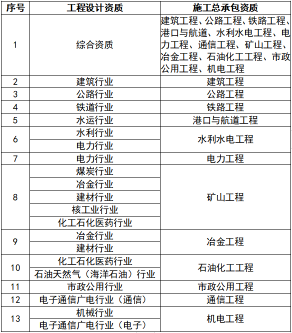 工程設(shè)計(jì)資質(zhì)與施工總承包資質(zhì)類別對(duì)照表