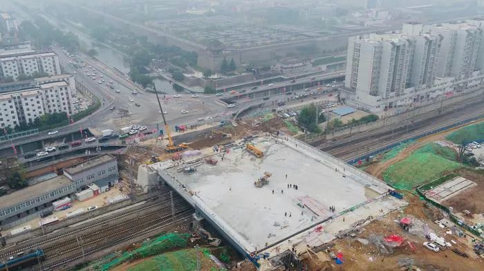 據(jù)了解,西安太華路立交橋建于1992年,橋長(zhǎng)22米,寬34米,位于西安火車站東咽喉區(qū),跨隴海鐵路上下行正線。西安太華路立交橋改擴(kuò)建項(xiàng)目,是西安火車站改擴(kuò)建工程的重要環(huán)節(jié)、南北站場(chǎng)改建的控制性工程。按照西安市政規(guī)劃,該橋改擴(kuò)建后為兩跨三幅,橋長(zhǎng)65米,寬63米,箱梁44片。因舊橋拆除、新橋建設(shè)均在隴海鐵路營(yíng)業(yè)線或鄰近營(yíng)業(yè)線施工,施工難度大、安全風(fēng)險(xiǎn)高。