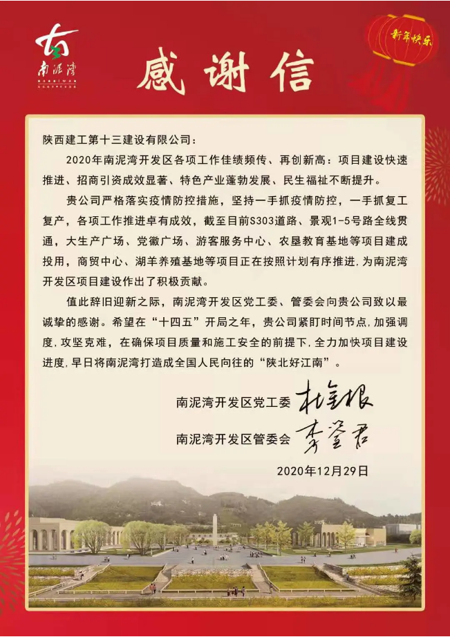 感謝信中提到,2020年陜建十三建公司嚴(yán)格落實(shí)疫情防控措施,堅(jiān)持一手抓疫情防控,一手抓復(fù)工復(fù)產(chǎn),各項(xiàng)工作推進(jìn)卓有成效,截止目前S303道路、景觀1-5號(hào)路全線貫通,大生產(chǎn)廣場(chǎng)、黨徽廣場(chǎng)、游客服務(wù)中心、農(nóng)墾教育基地等項(xiàng)目建成投用,商貿(mào)中心、湖羊養(yǎng)殖基地等項(xiàng)目正在按照計(jì)劃有序推進(jìn),為南泥灣開發(fā)區(qū)項(xiàng)目建設(shè)作出了積極貢獻(xiàn)。