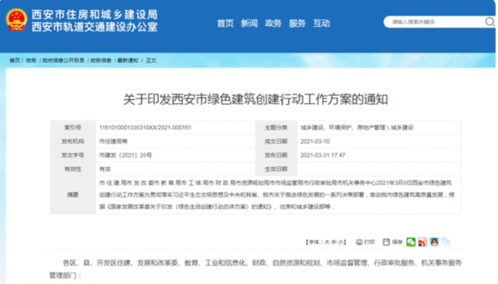 日前,西安市住建局發(fā)布關(guān)于印發(fā)西安市綠色建筑創(chuàng)建行動(dòng)工作方案的通知。