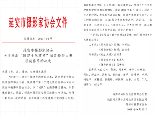 9月29日,由延安市城區(qū)改造指揮部辦公室聯(lián)合陜西建工第十三建設(shè)集團(tuán)有限公司主辦、延安市攝影家協(xié)會(huì)承辦的“陜建十三建杯”城改攝影比賽頒獎(jiǎng)儀式暨獲獎(jiǎng)作品展在延安市小東門廣場圣地影像畫廊圓滿舉行。