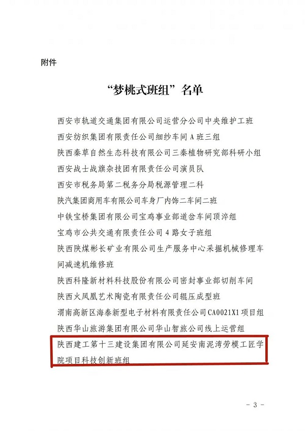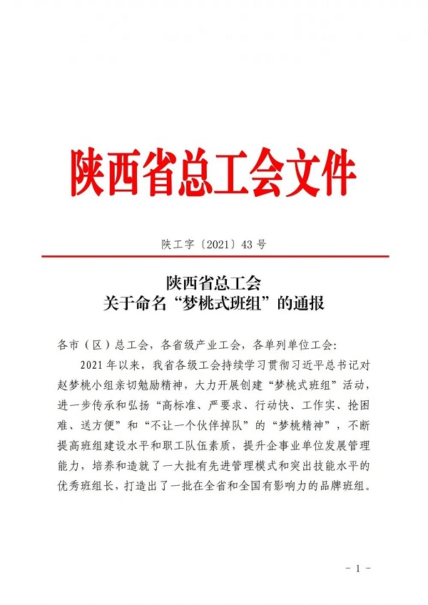 為進(jìn)一步傳承和弘揚(yáng)“高標(biāo)準(zhǔn)、嚴(yán)要求、行動(dòng)快、工作實(shí)、搶困難、送方便”和“不讓一個(gè)伙伴掉隊(duì)”的“夢桃精神”,近日,陜西省總工會(huì)對全省50個(gè)優(yōu)秀班組進(jìn)行了榮譽(yù)表彰,授予他們“夢桃式班組”榮譽(yù)稱號,集團(tuán)延安南泥灣勞模工匠學(xué)院項(xiàng)目科技創(chuàng)新班組獲此殊榮。