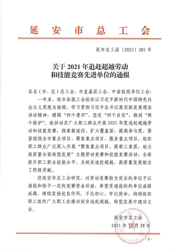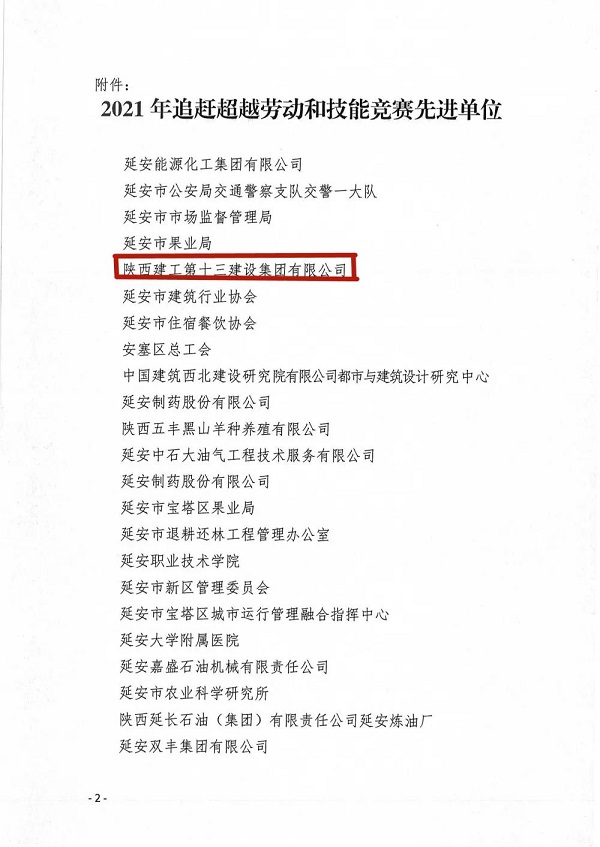 近日,延安市總工會公布了2021年追趕超越勞動和技能競賽先進(jìn)單位名單。陜建十三建集團(tuán)榮獲延安市2021年追趕超越勞動和技能競賽先進(jìn)單位。