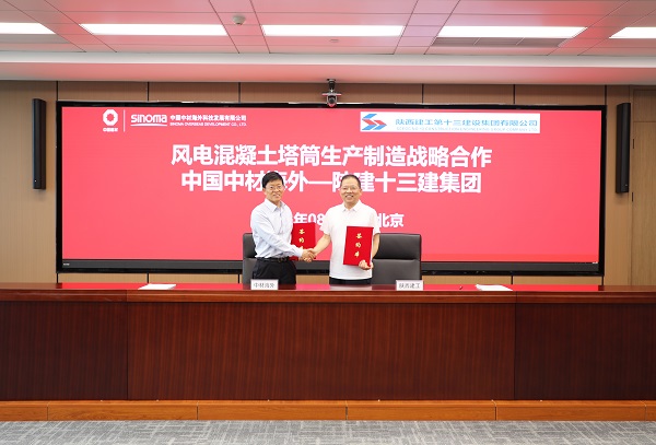 8月1日,集團(tuán)與中國中材海外科技發(fā)展有限公司在北京就風(fēng)電混凝土塔筒生產(chǎn)制造簽訂戰(zhàn)略合作協(xié)議并簽訂陜西榆林定邊項(xiàng)目混凝土塔筒預(yù)制管片采購合同。中國中材海外科技發(fā)展有限公司黨委書記、執(zhí)行董事高超,集團(tuán)黨委書記、董事長卜國平代表雙方簽約并致辭。