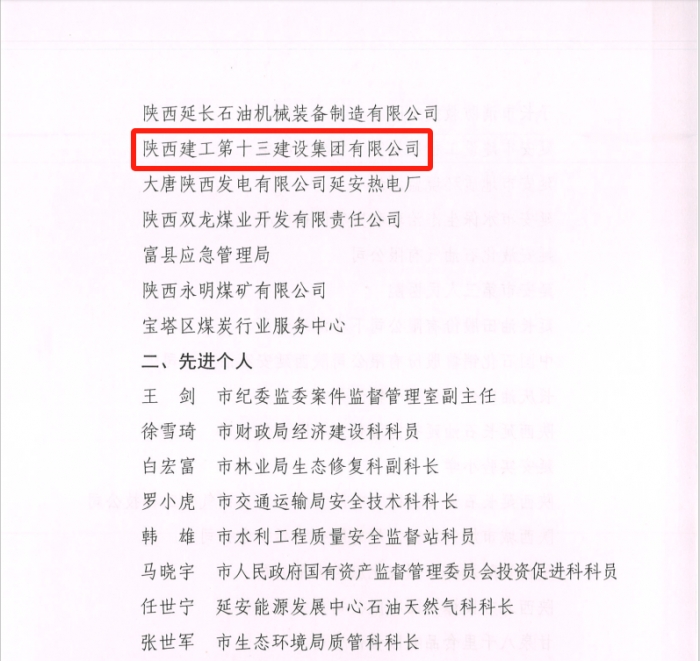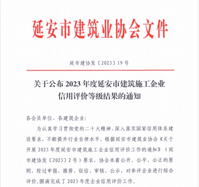 同時,延安市建協(xié)公布了2023年度延安市建筑施工企業(yè)信用評級結(jié)果:陜建十三建集團被評為AAA級企業(yè)。